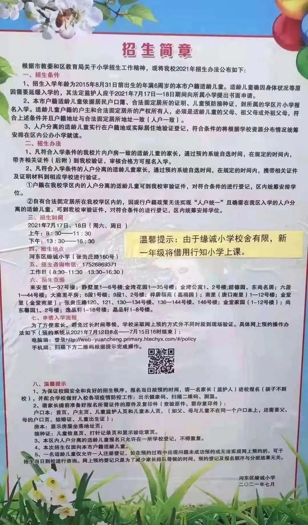 2021年天津市河东区缘诚小学招生简章,含招生咨询电话和学区范围划分