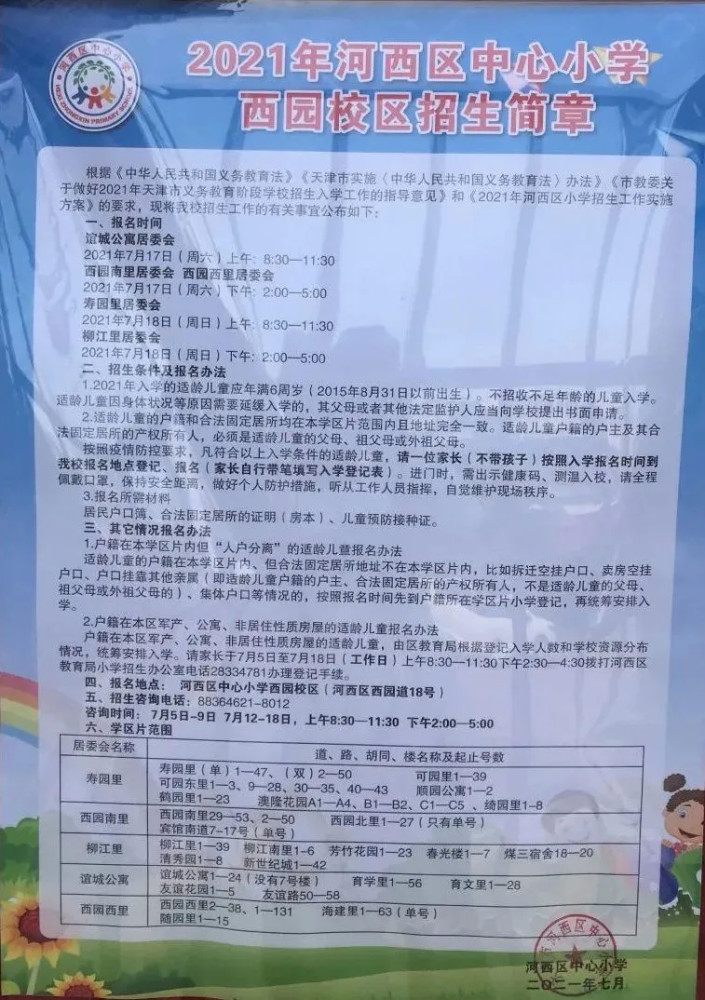 2021年天津市河西区河西中心小学西园校区招生简章,含招生咨询电话和学区范围划分
