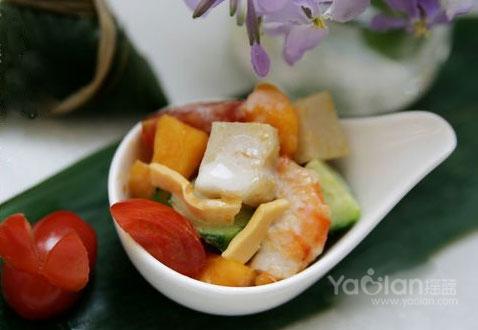 原料:熟虾、熟粽子、黄瓜、芒果、圣女果、乳酪片、酸奶、盐适量