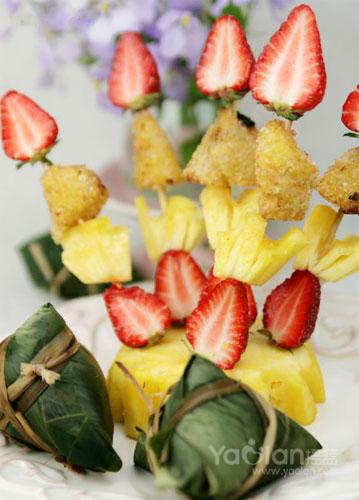将很少的油炸粽子与多样水果搭配成串,水果的甜美可以分散孩子对油炸食品的注意力,同时也能解腻。而且外观非常吸引人,也是举办小朋友聚会的亮点。