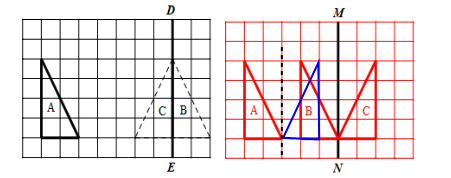 (2)通过观察图形,可知左边的图形B和图形C关于对称轴DE对称;