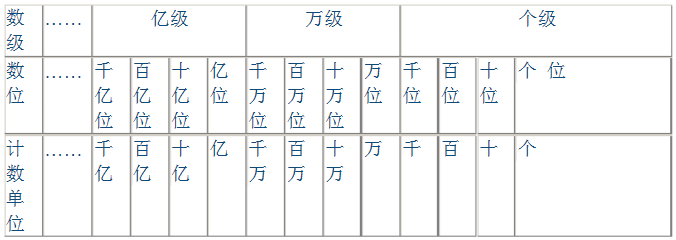 1.认识数级、数位、计数单位,并了解它们之间的对应关系
