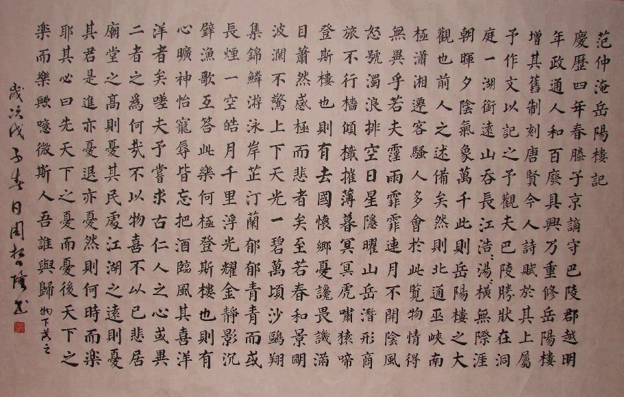 这一段是全篇的重心,以“嗟夫”开启,兼有抒情和议论的意味。作者在列举了悲喜两种情境后,笔调突然激扬,道出了超乎这两者之上的一种更高的理想境界,那就是“不以物喜,不以己悲”。感物而动,因物悲喜虽然是人之常情,但并不是做人的最高境界。古代的仁人,就有坚定的意志,不为外界条件的变化动摇。无论是“居庙堂之高”还是“处江湖之远”,忧国忧民之心不改,“进亦忧,退亦忧”。这似乎有悖于常理,有些不可思议。作者也就此拟出一问一答,假托古圣立言,发出了“先天下之忧而忧,后天下之乐而乐”的誓言,曲终奏雅,点明了全篇的主旨。“噫!微斯人,吾谁与归”一句结语,“如怨如慕,如泣如诉”,悲凉慷慨,一往情深,令人感喟。