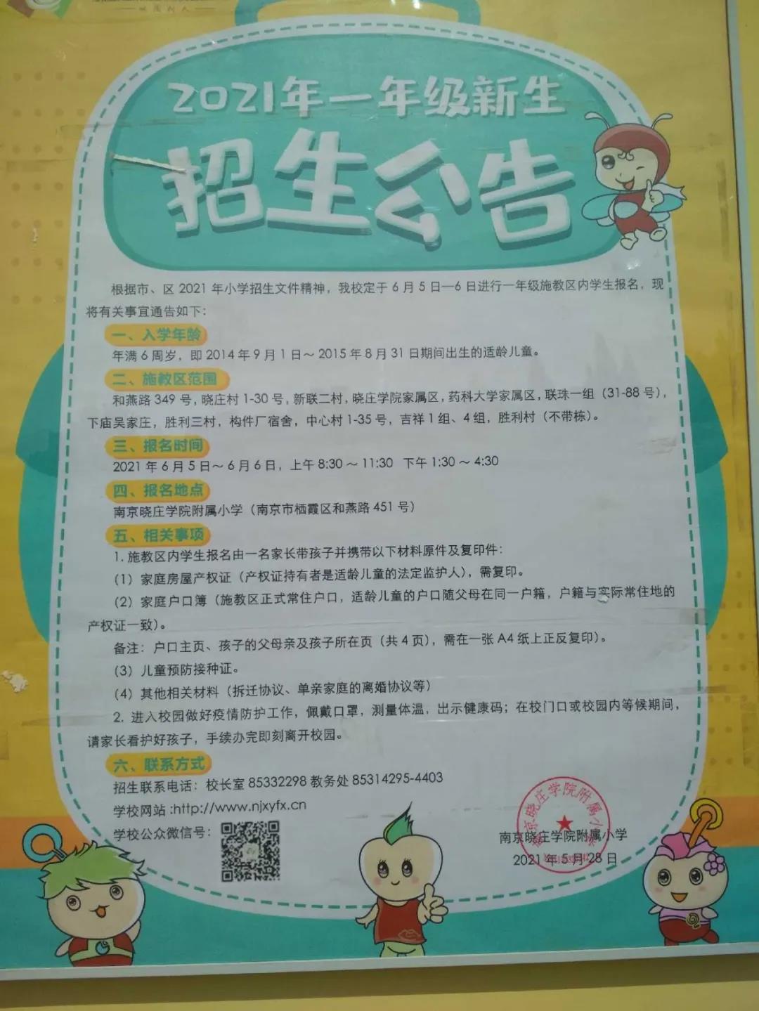 2021年南京市晓庄学院附属小学一年级招生简章,含学区施教区范围划分和招生咨询电话