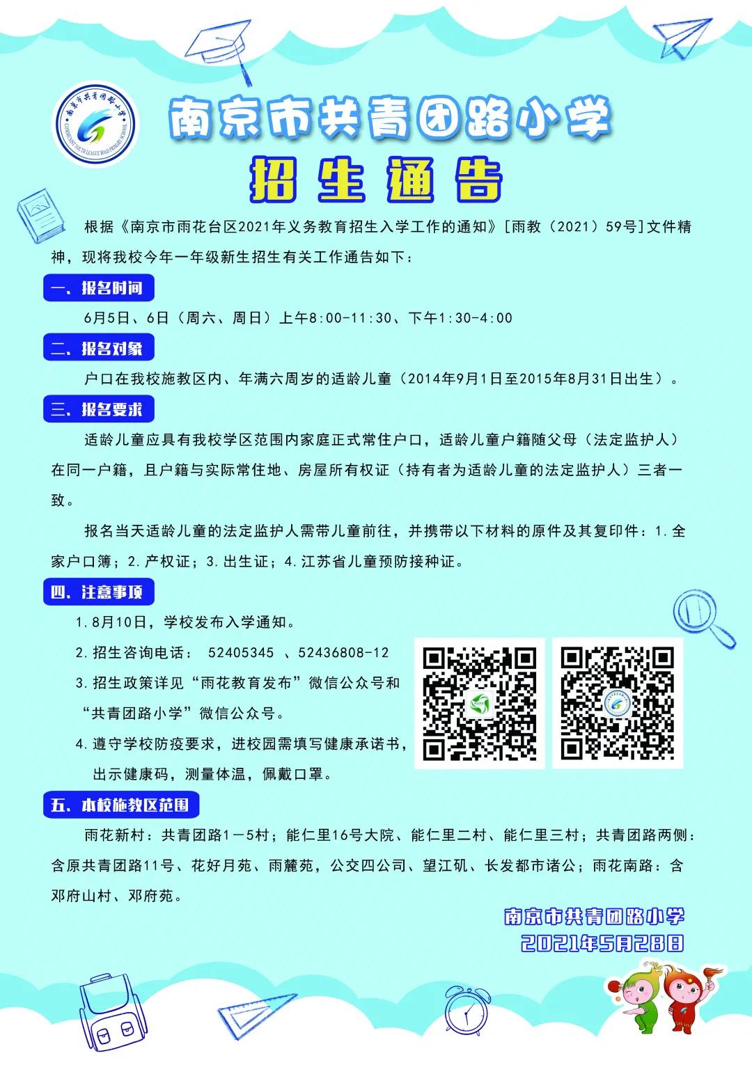 2021年南京市共青团路小学招生简章,含施教区范围划分和招生咨询电话