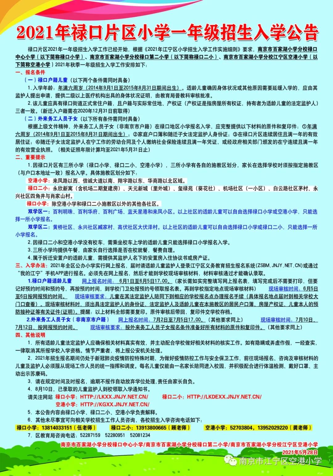 2021年南京市百家湖小学分校禄口中心小学、禄口第二小学、江宁区空港小学招生简章,含招生咨询电话