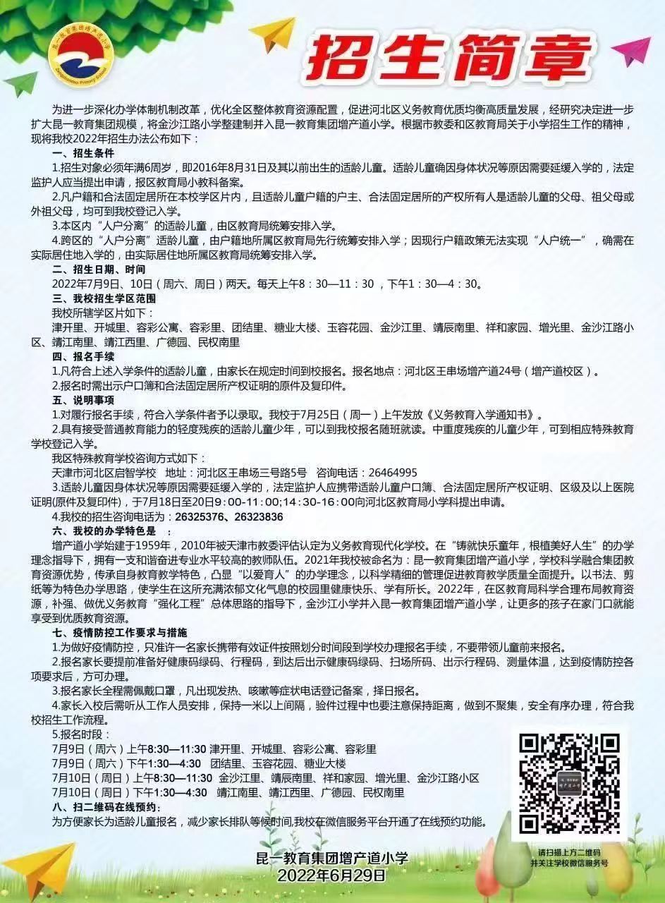 2022年天津市河北区增产道小学招生简章,含招生咨询电话和学区范围划分
