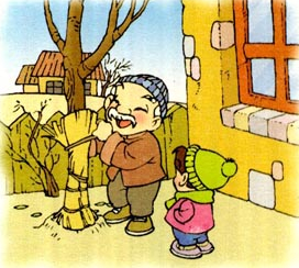 冬天到了,爷爷给小树穿上暖和的衣裳。小树不冷了。