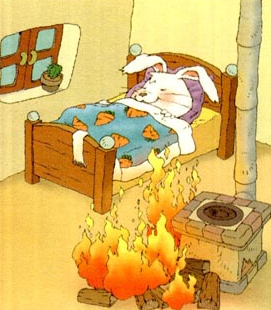 小白兔玩累了,就回家休息。屋子很冷,他往火里加了一些柴,就上床睡觉了。