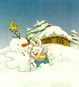 兔妈妈要出去找吃的。她堆了一个漂亮的雪孩子,让他和小白兔一起玩。