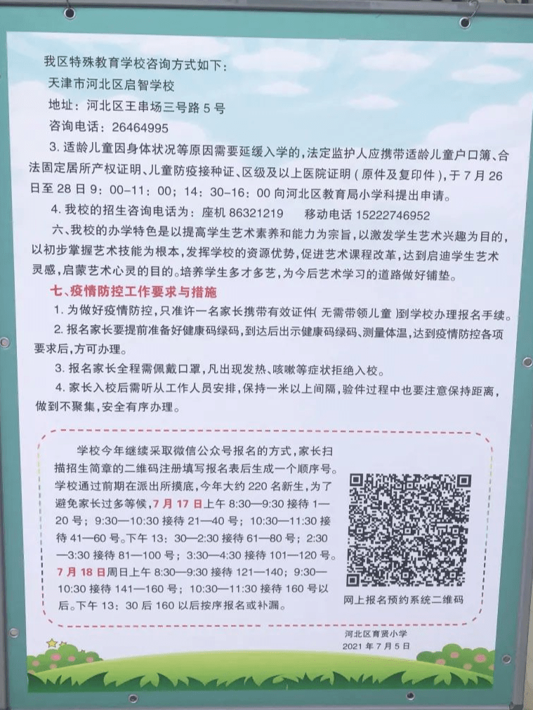 2021年天津市河北区育贤小学招生简章,含招生咨询电话和学区范围划分