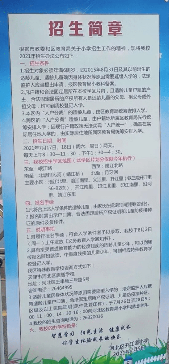 2021年天津市河北区开江道小学招生简章,含招生咨询电话和学区范围划分