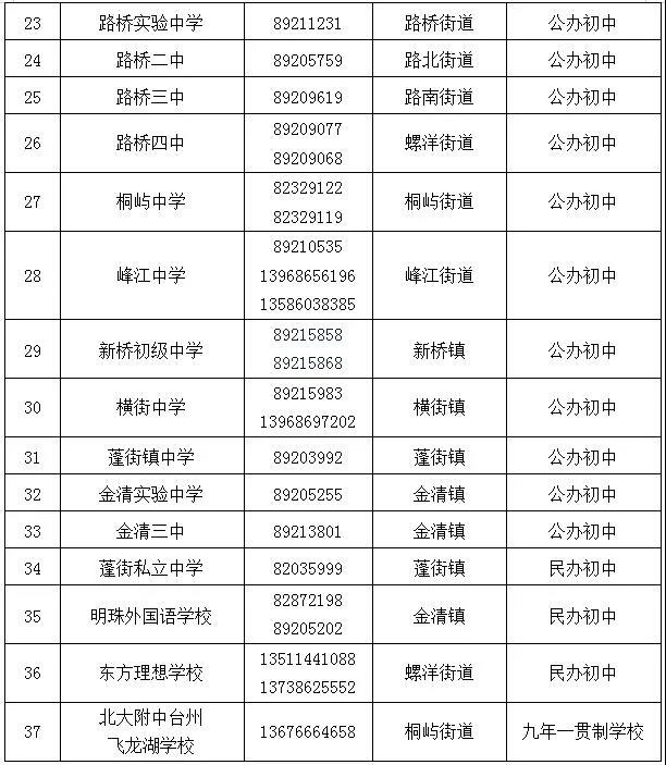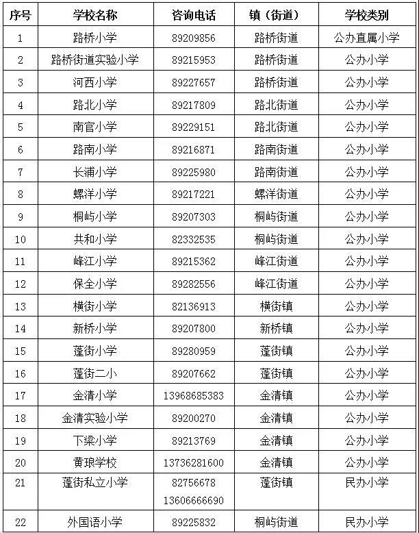2020年浙江省台州市义务教育招生路桥区各学校联络咨询电话