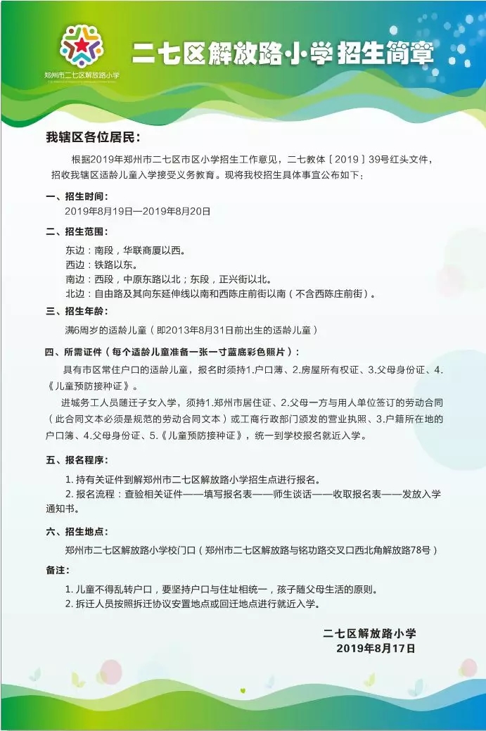 郑州市二七区解放路小学2019年招生简章、划片信息及幼小衔接资源、书籍推荐