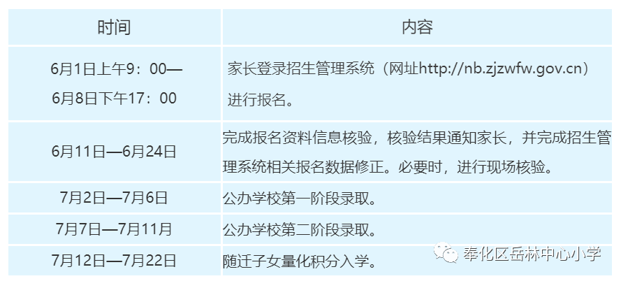 2020年,奉化区义务段新生入学实施网上招生,即通过“宁波市幼儿园入园、义务教育入学报名招生系统”进行入学报名、审核、录取。
