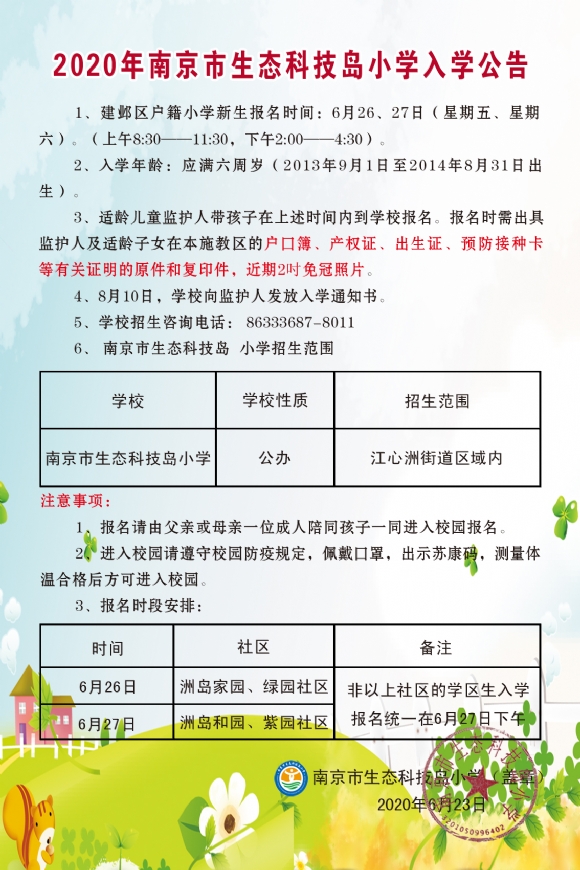 2020年南京市生态科技岛小学入学公告招生简章