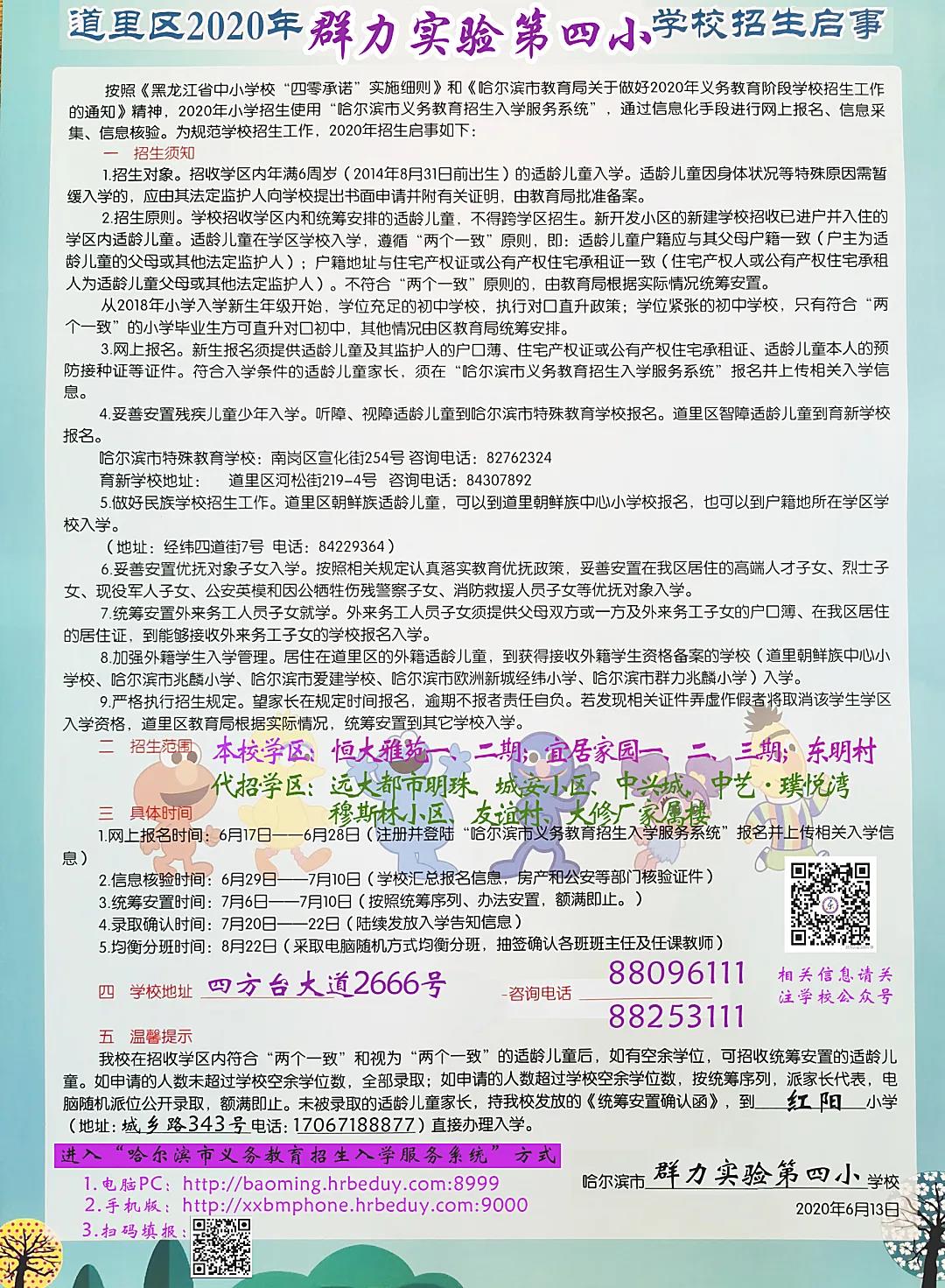 4.“哈尔滨市义务教育招生入学服务系统”将于6月14日开放,进入模拟测试阶段。14日、15日两天各位家长可登陆平台仔细阅读报名须知,按程序进行模拟填报(模拟填报为无效填报);16日系统刷新,全部数据清空;正式报名以6月17日以后填报为准。