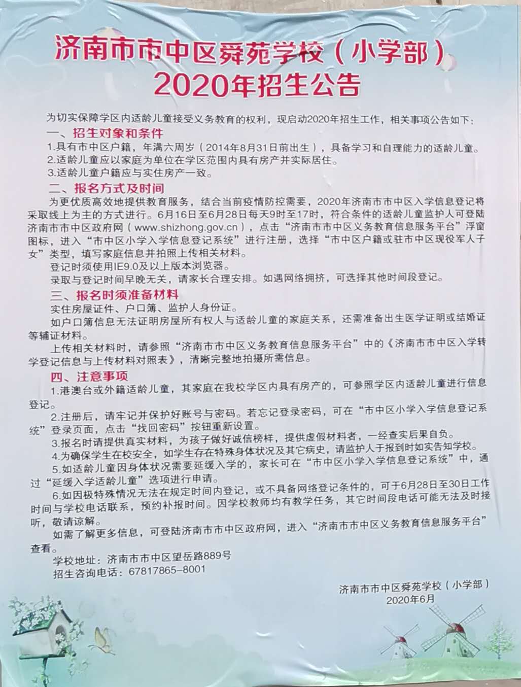 济南市市中区舜苑学校(小学部)2020年招生公告及招生咨询电话