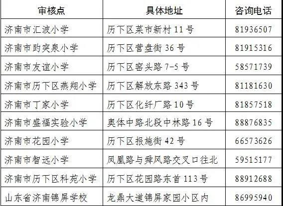 仅具有历下区户籍的适龄儿童积分入学材料审核点 历下区共设立了10个材料审核点。家长可以按照网上预约的审核点和时间按时去提交材料。未能预约成功的,请选择就近的审核点提交材料。审核点与录取学校无关。