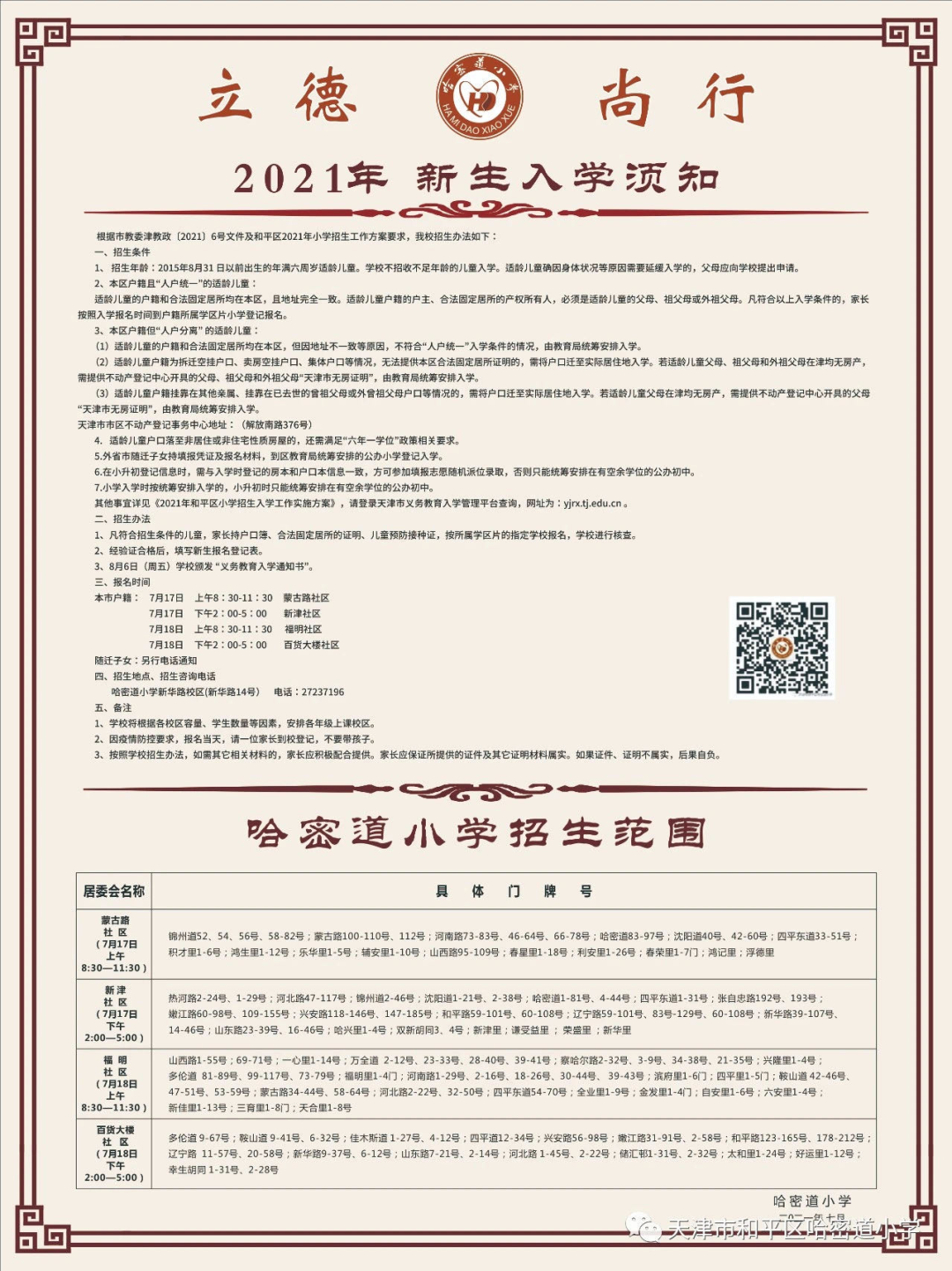 2021年天津市和平区哈密道小学招生简章,含招生咨询电话和学区范围划分