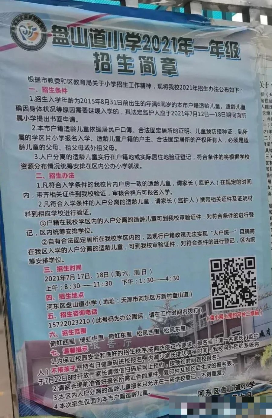 2021年天津市河东区盘山道小学招生简章,含招生咨询电话和学区范围划分