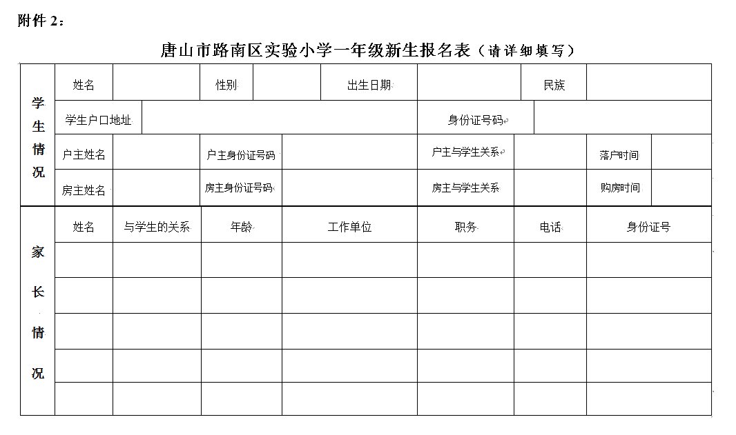 1.请家长自行下载、打印并填写《唐山市路南区实验小学年级新生报名表》报名时上交。