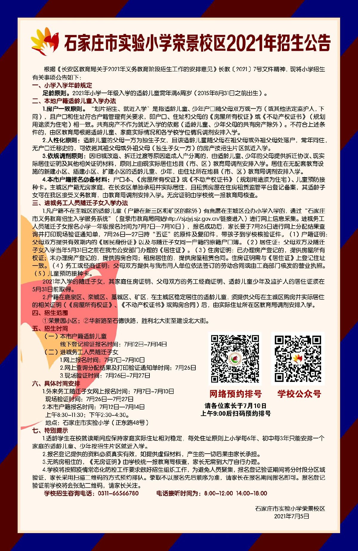 2021年石家庄实验小学荣景校区招生简章,含招生咨询电话