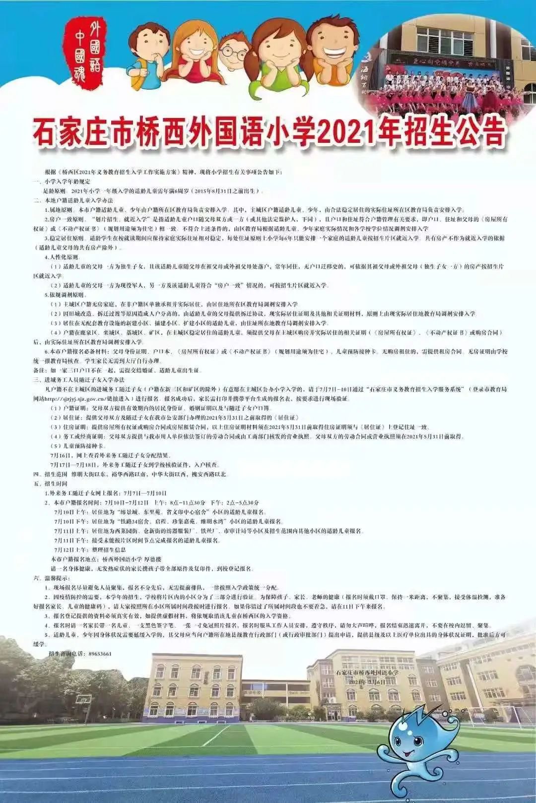 2021年石家庄桥西外国语小学招生简章,含招生咨询电话