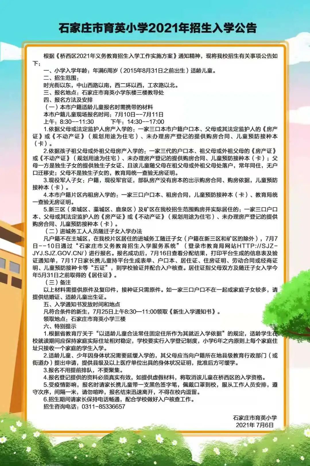 2021年石家庄育英实验小学招生简章,含招生咨询电话