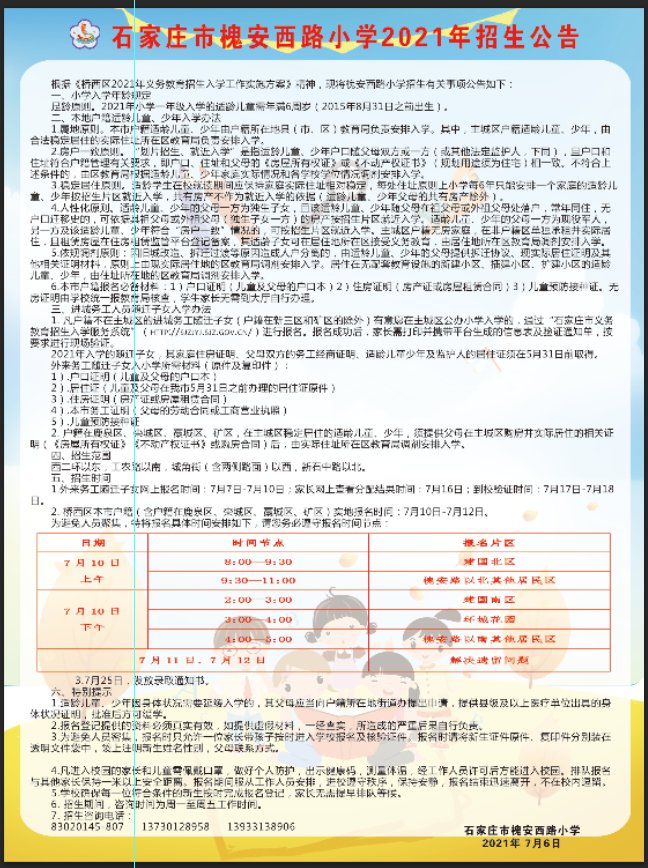 2021年石家庄槐安西路小学招生简章,含招生咨询电话