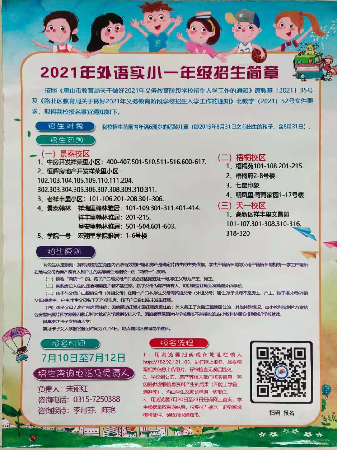 2021年唐山市路北区外语实验小学一年级招生简章,含招生咨询电话