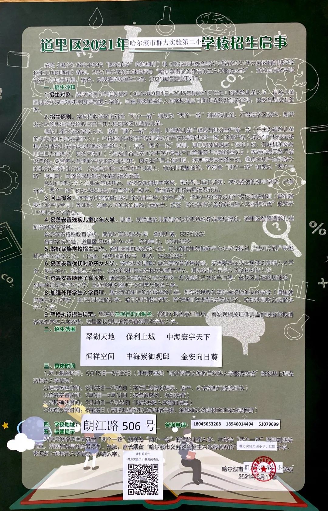 2021年哈尔滨市群力实验第二小学校招生公告,含招生咨询电话