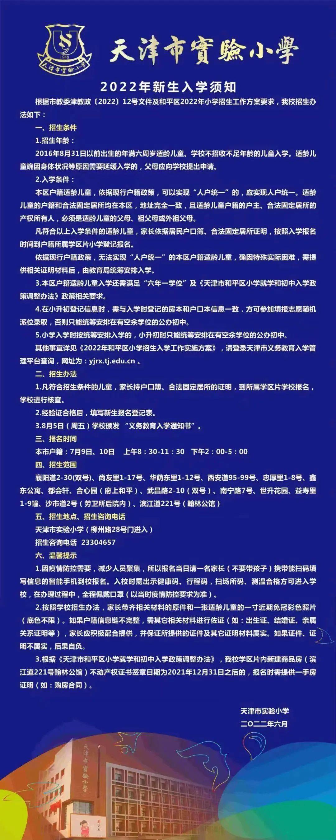 2022年天津市和平区实验小学招生简章,含小学学区招生范围划分以及招生咨询电话