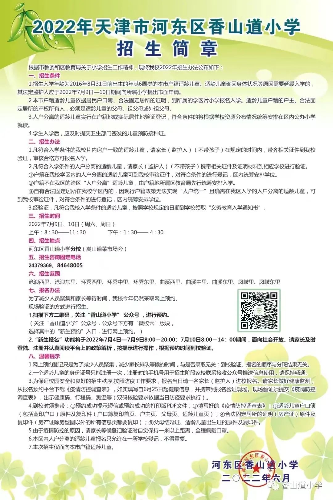 2022年天津市河东区香山道小学招生简章,含小学学区招生范围划分以及招生咨询电话
