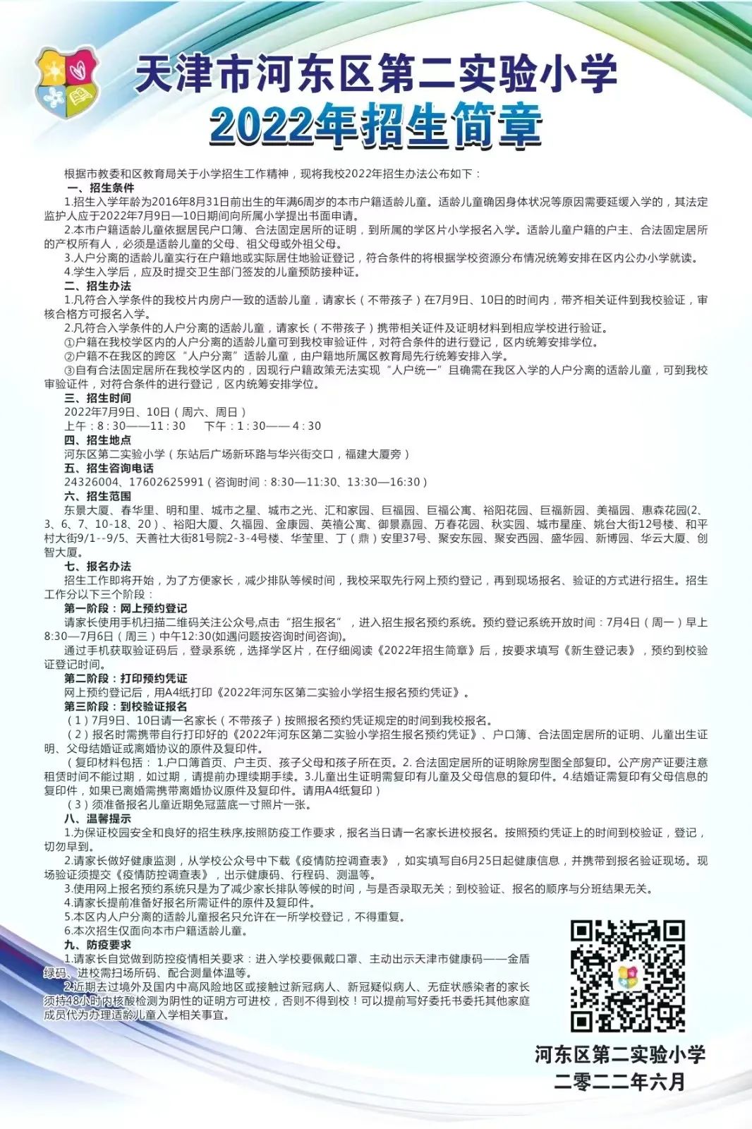2022年天津市河东区第二实验小学招生简章,含小学学区招生范围划分以及招生咨询电话