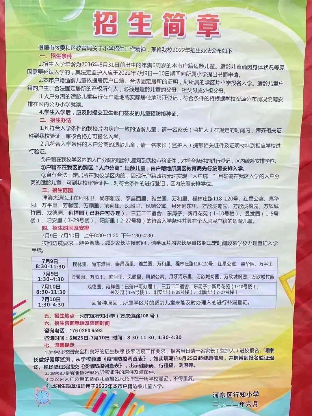 2022年天津市河东区行知小学招生简章,含小学学区招生范围划分以及招生咨询电话