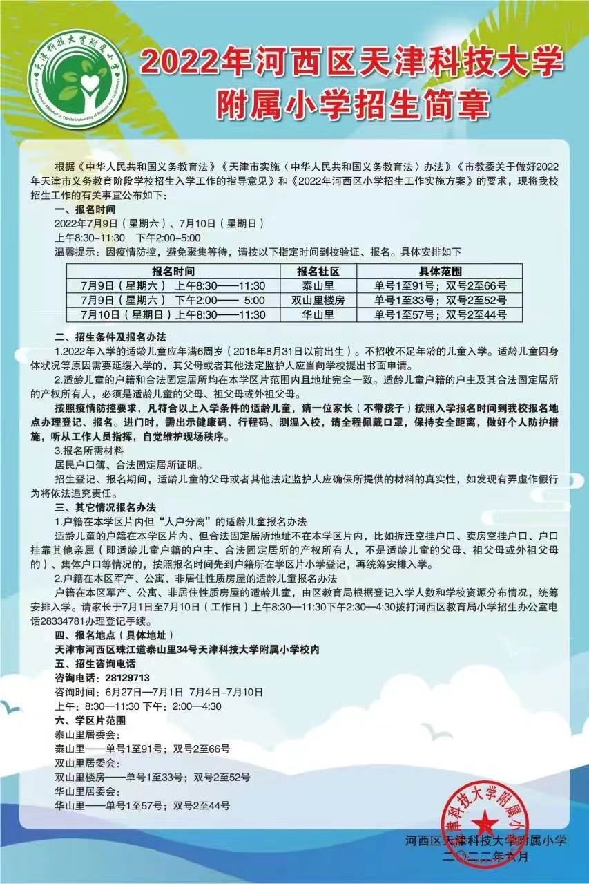 2022年天津市天津科技大学附属小学招生简章,含招生咨询电话和学区范围划分