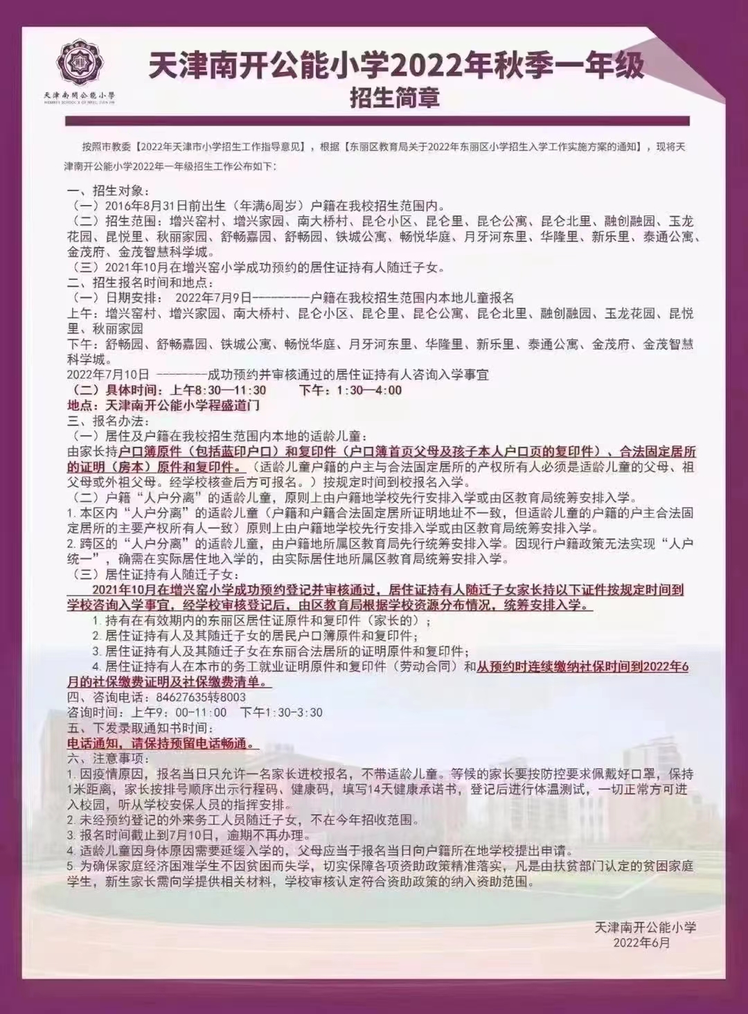 2022年天津市南开区公能小学招生简章,含招生咨询电话和学区范围划分
