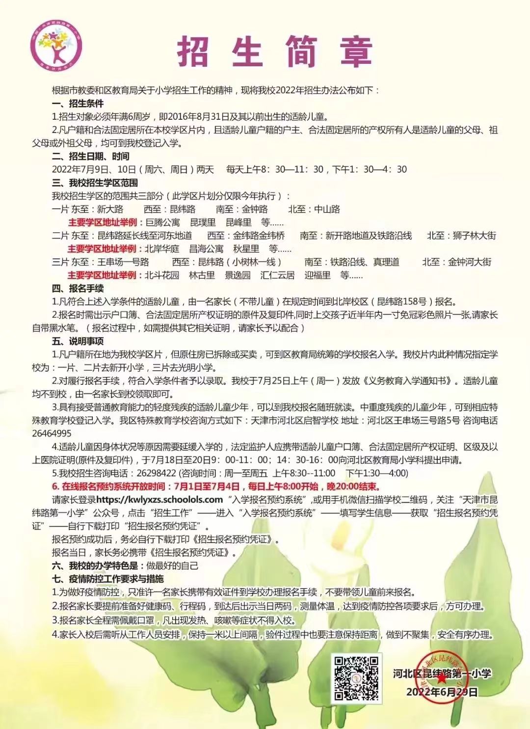 2022年天津市河北区昆纬路第一小学招生简章,含招生咨询电话和学区范围划分