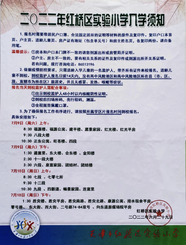 2022年天津市红桥区实验小学招生简章,含招生咨询电话和学区范围划分