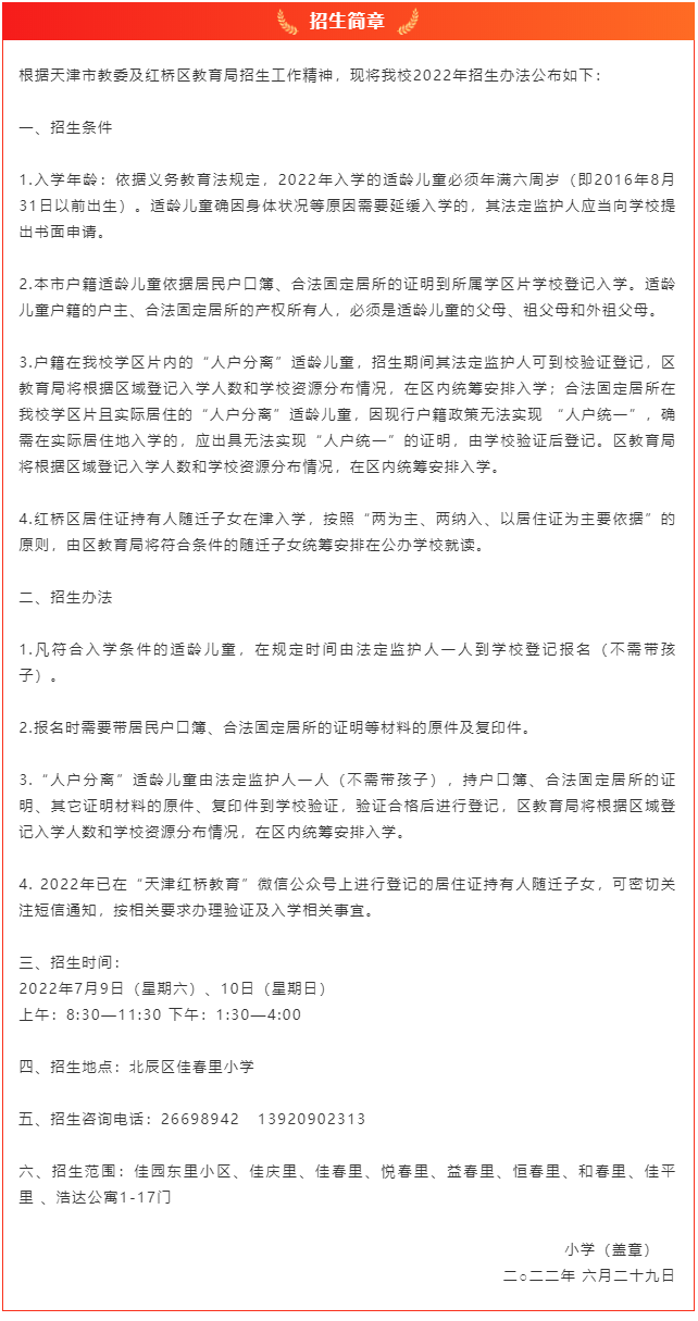 2022年天津市红桥区佳春里小学招生简章,含招生咨询电话和学区范围划分