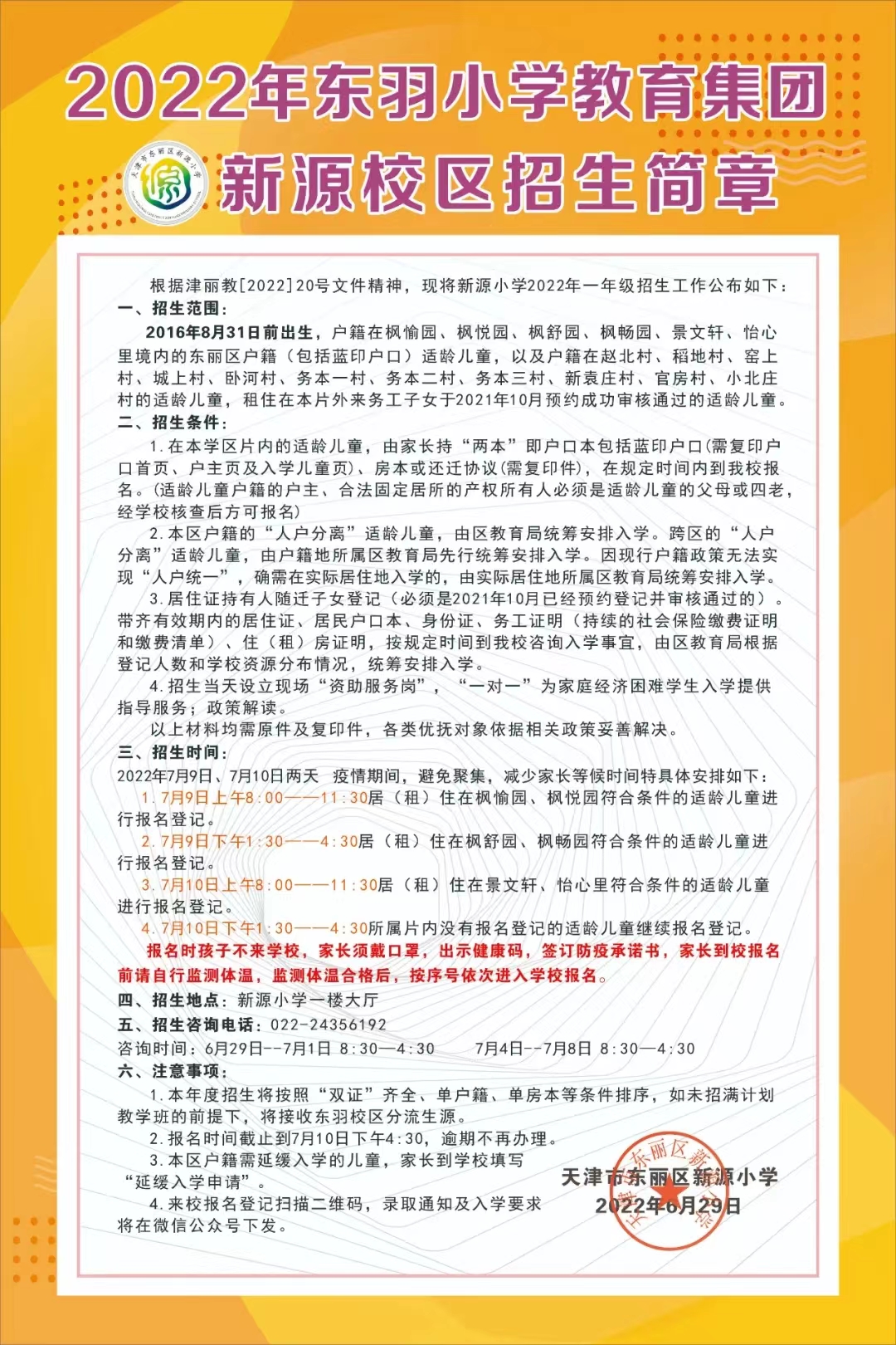 2022年天津市东丽区新源小学招生简章,含招生咨询电话