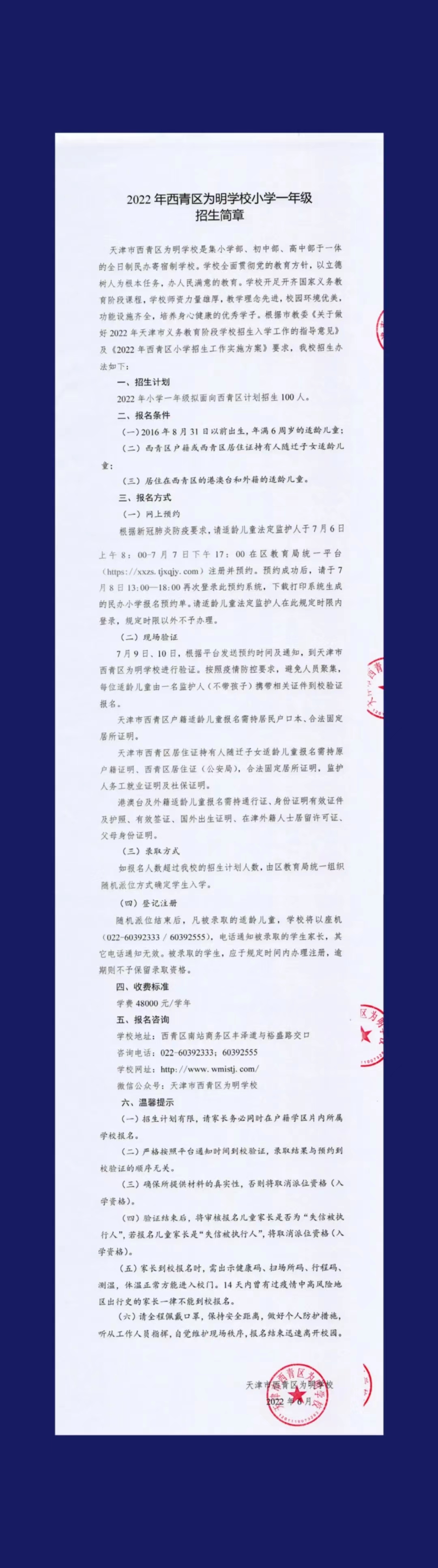 2022年天津市西青区为民学校小学一年级招生简章,含招生咨询电话