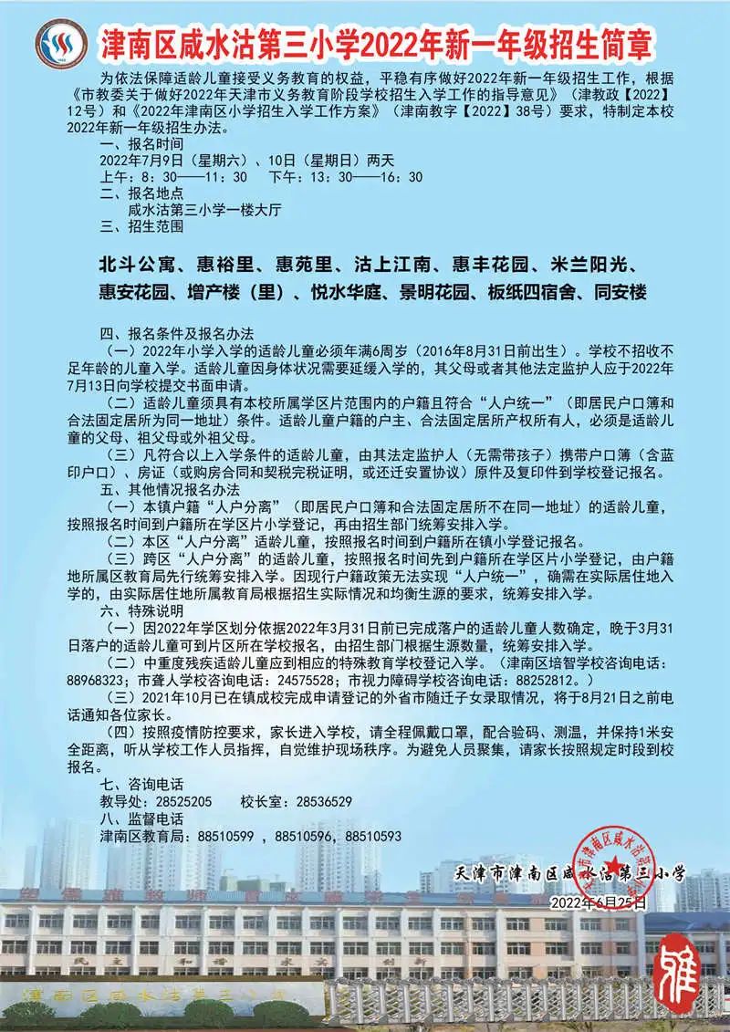 2022年天津市津南区咸水沽第三小学招生简章,含招生咨询电话和学区范围划分