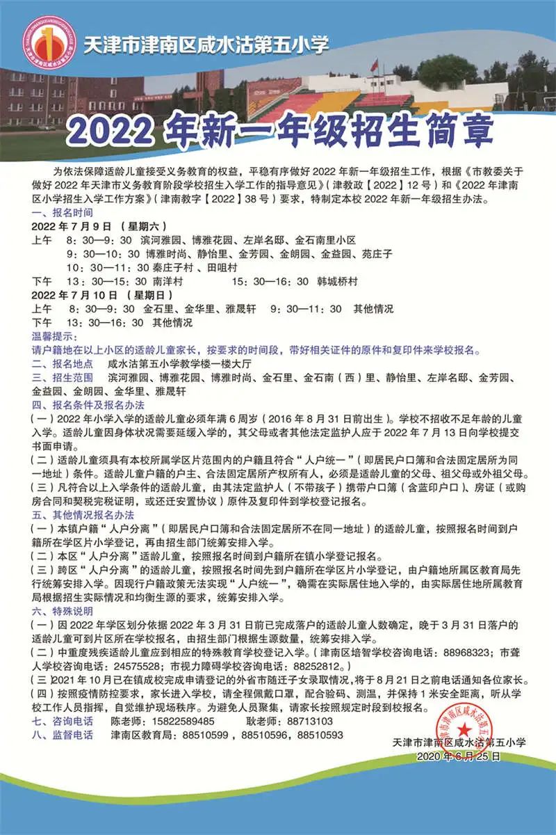 2022年天津市津南区咸水沽第五小学招生简章,含招生咨询电话和学区范围划分