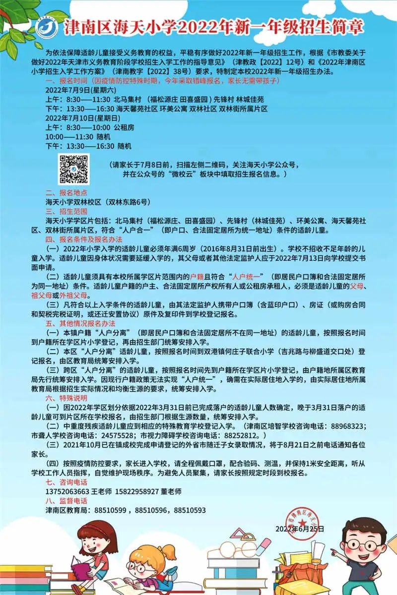 2022年天津市津南区海天小学招生简章,含招生咨询电话和学区范围划分
