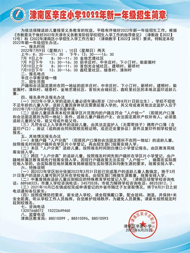 2022年天津市津南区辛庄小学招生简章,含招生咨询电话和学区范围划分
