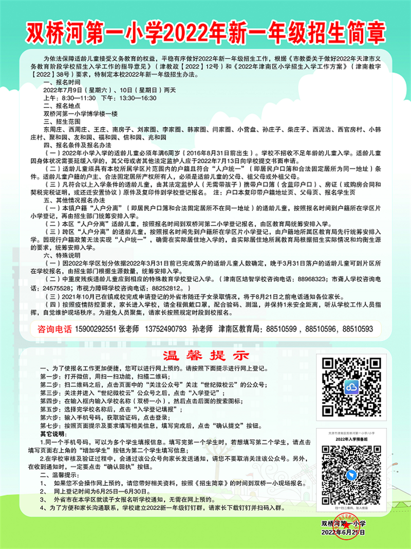 2022年天津市津南区双桥河第一小学招生简章,含招生咨询电话和学区范围划分