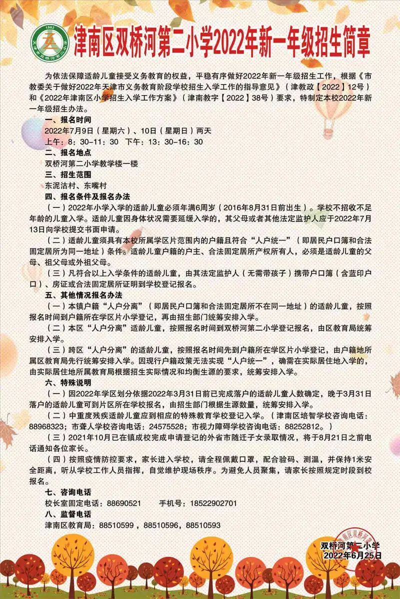 2022年天津市津南区双桥河第二小学招生简章,含招生咨询电话和学区范围划分