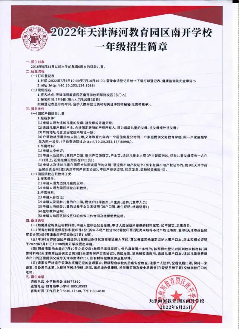2022年天津市津南区海河教育园区南开学校招生简章,含招生咨询电话和学区范围划分